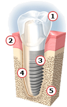 A dental implant is a small, sturdy, titanium post that acts as the root structure would for a natural tooth. A dental implant is placed into your upper or lower jaw bone. After the bone has grown around the implant, implants can hold a crown, bridge or over-denture just like roots hold natural teeth in place. Implants are very durable and can last a lifetime. They require the same maintenance as natural teeth; this includes brushing, flossing and regular dental check-ups.